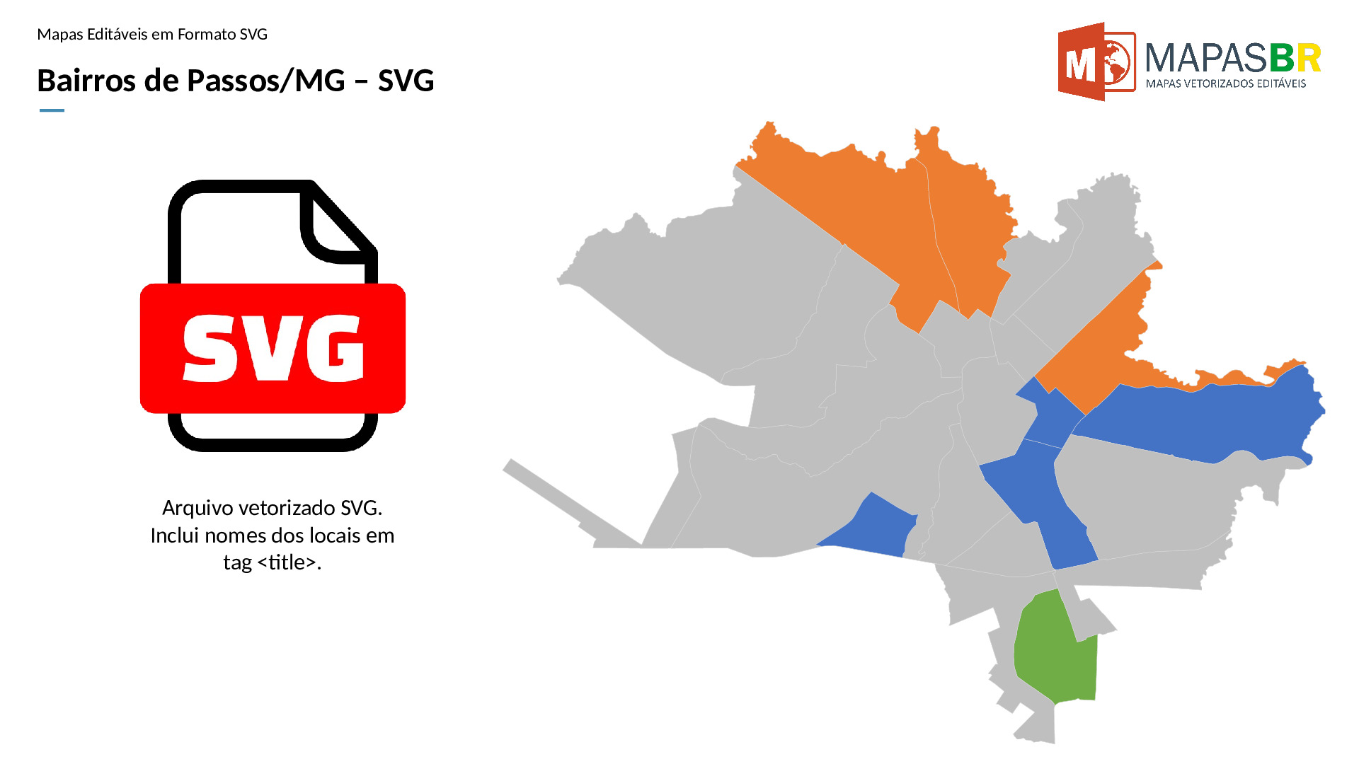 Bairros de Passos/MG em formato SVG, compatível com web e diversos aplicativos de edição de texto ou gráfico.