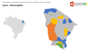 Mapas do estado do Ceará editáveis no Powerpoint com divisões por municípios, microrregiões e regiões geográficas conforme IBGE. Cada região dos mapas pode ser editada individualmente, incluindo cores de fundo, bordas, sombras, efeitos e animações.