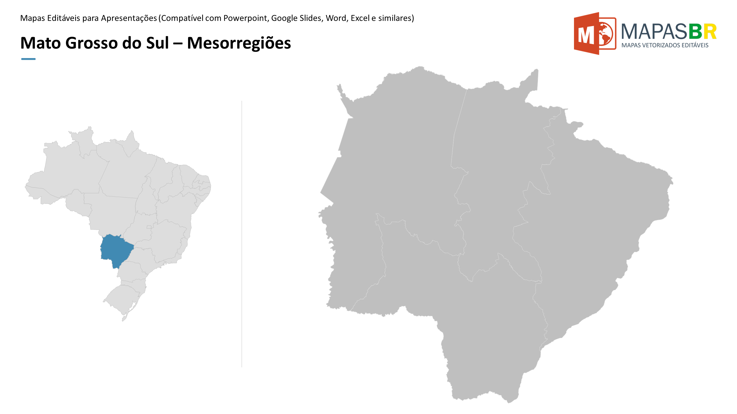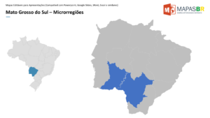 Mapas do estado do Mato Grosso do Sul editáveis no Powerpoint com divisões por municípios, microrregiões e regiões geográficas conforme IBGE. Cada região dos mapas pode ser editada individualmente, incluindo cores de fundo, bordas, sombras, efeitos e animações.